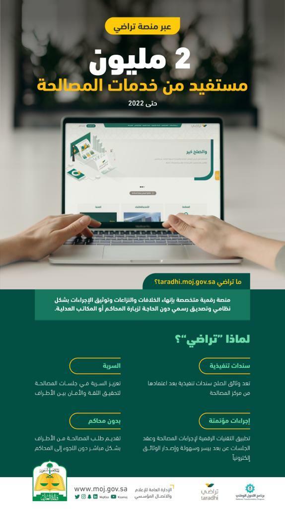 كشفت وزارة العدل عن عدد المستفيدين من خدمات المصالحة عبر منصة "تراضي" الإلكترونية، موضحة أنه بلغ أكثر من 2 مليون مستفيد، حتى نهاية عام 2022.