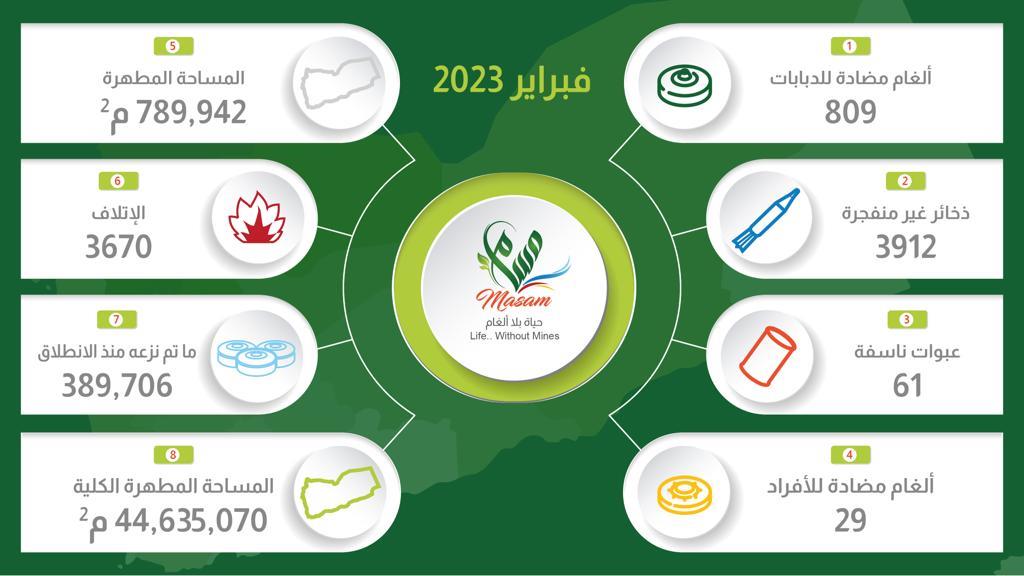 تمكن مشروع مركز الملك سلمان للإغاثة والأعمال الإنسانية "مسام" من انتزاع 4811 لغماً وذخيرة غير منفجرة وعبوة ناسفة خلال شهر فبراير الماضي، بعد أن قامت ميليشيات الحوثي الإرهابية بزراعتها، وتوزيعها على مختلف مناطق اليمن.