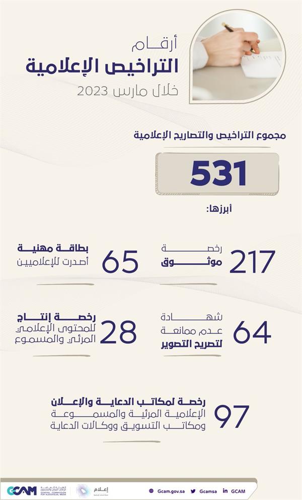 وأوضحت الهيئة أنه تم إصدار 217 رخصة لـ "موثوق"، و56 بطاقة مهنية أصدرت لإعلاميين، و64 شهادة عدم ممانعة للتصوير، و2 رخصة لإنتاج المحتوى، و97 رخصة لمكاتب الدعاية والإعلان.