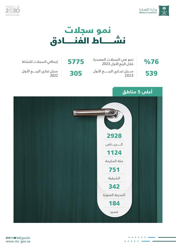 وأشارت إلى أن أعلى المناطق من حيث إصدار السجلات التجارية لنشاط الفنادق هي الرياض بـ2928 سجلا، تلتها مكة المكرمة بـ1124، ثم الشرقية بـ751 سجلا، فالمدينة المنورة بـ342 سجلا، ثم عسير بـ184 سجلا تجاريا.
