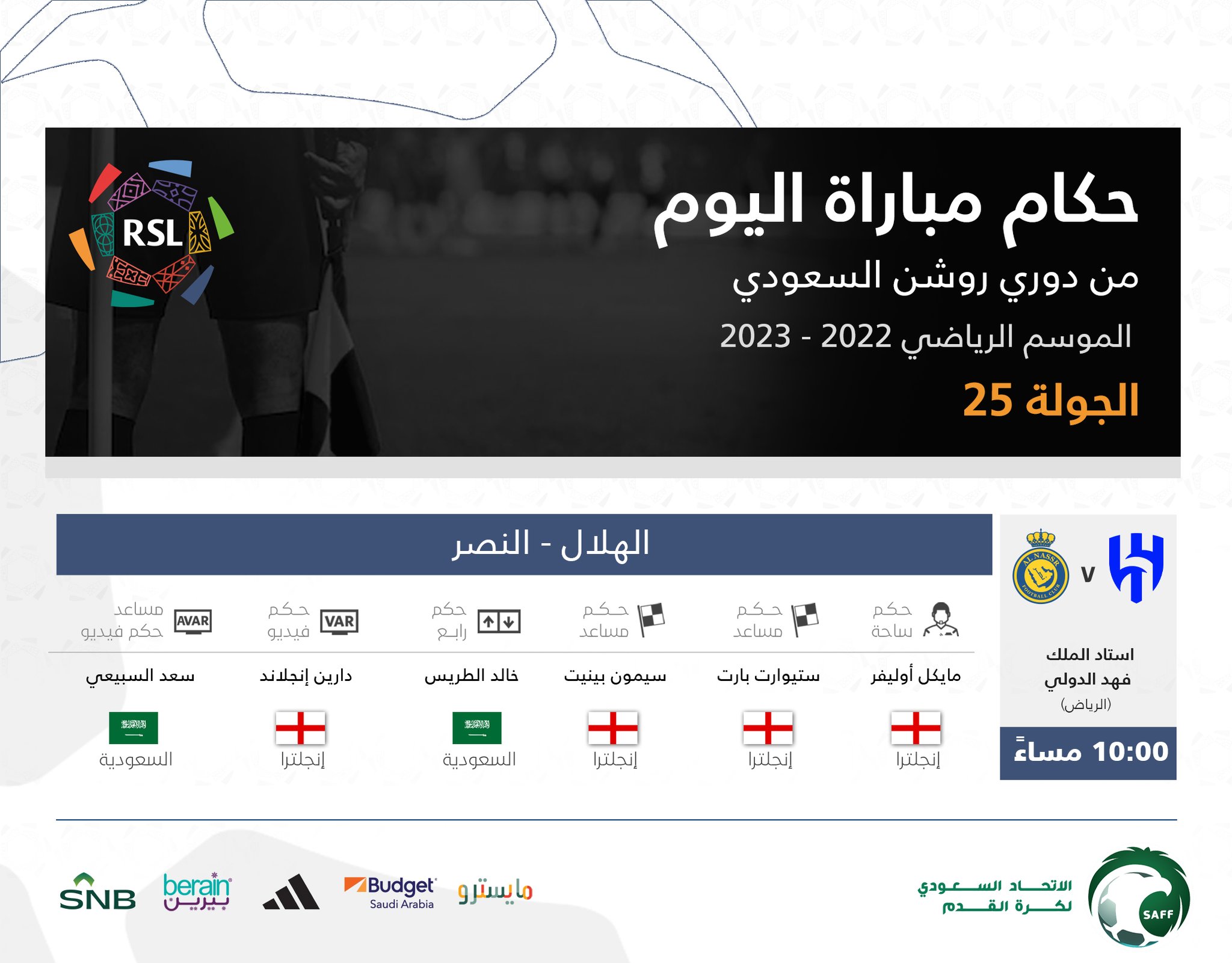ويقود ديربي الرياض بين الهلال والنصر، حكم الساحة الإنجليزي، مايكل أوليفر، وحكم مساعد ستيوارت بارت، وحكم مساعد ثان سيمون بينيت، وحكم رابع السعودي خالد الطريس، وحكم الفيديو دارين إنجلاند، ويساعده السعودي سعد السبيعي.