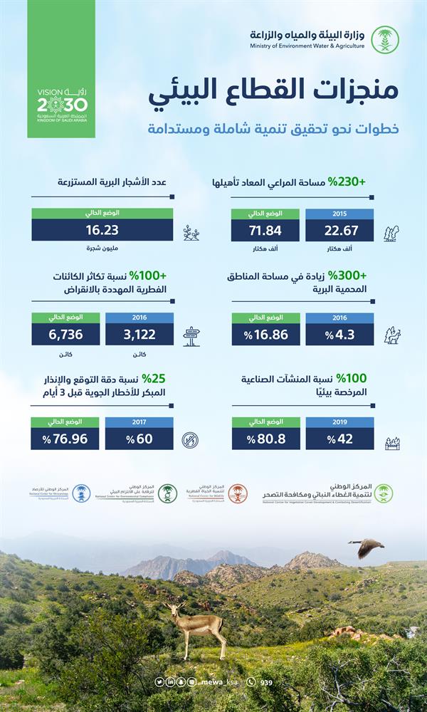 وتأتي هذه المنجزات في قطاع البيئة، ضمن الاستراتيجية الوطنية للبيئة التي تتضمن أكثر من 6 ركائز استراتيجية و64 مبادرة، منها إطلاق عدد من مبادرات التشجير ضمن مبادرة السعودية الخضراء، والتي حققت جميعها تقدماً ملموساً في مجالات الاستدامة المالية لقطاع البيئة، إلى جانب تطوير المتنزهات الوطنية وإدارتها، وتنمية وإعادة تأهيل الغطاء النباتي في الغابات والمراعي.
