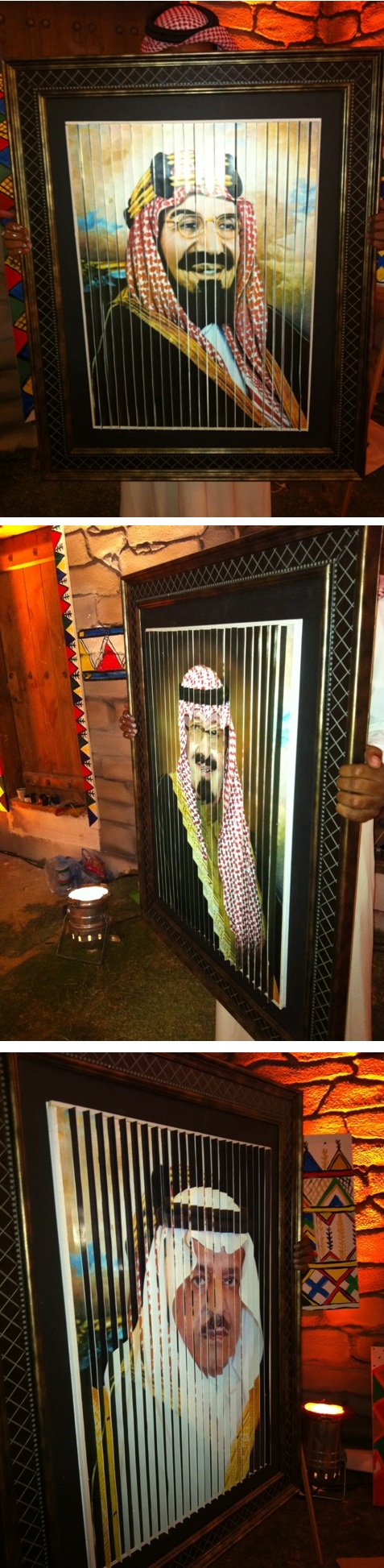 وجمعت الصورة بين خادم الحرمين الشريفين الملك عبدالله بن عبد العزيز وولي العهد الأمير نايف بن عبد العزيز مع المؤسس رحمه الله الملك عبد العزيز كل على حدة، فالناظر إلى الصورة من الأمام يرى الملك عبد العزيز فيما إذا نظر إليها من الناحية اليمنى يرى الملك عبد الله أما من الناحية اليسرى فيرى ولي العهد الأمير نايف.