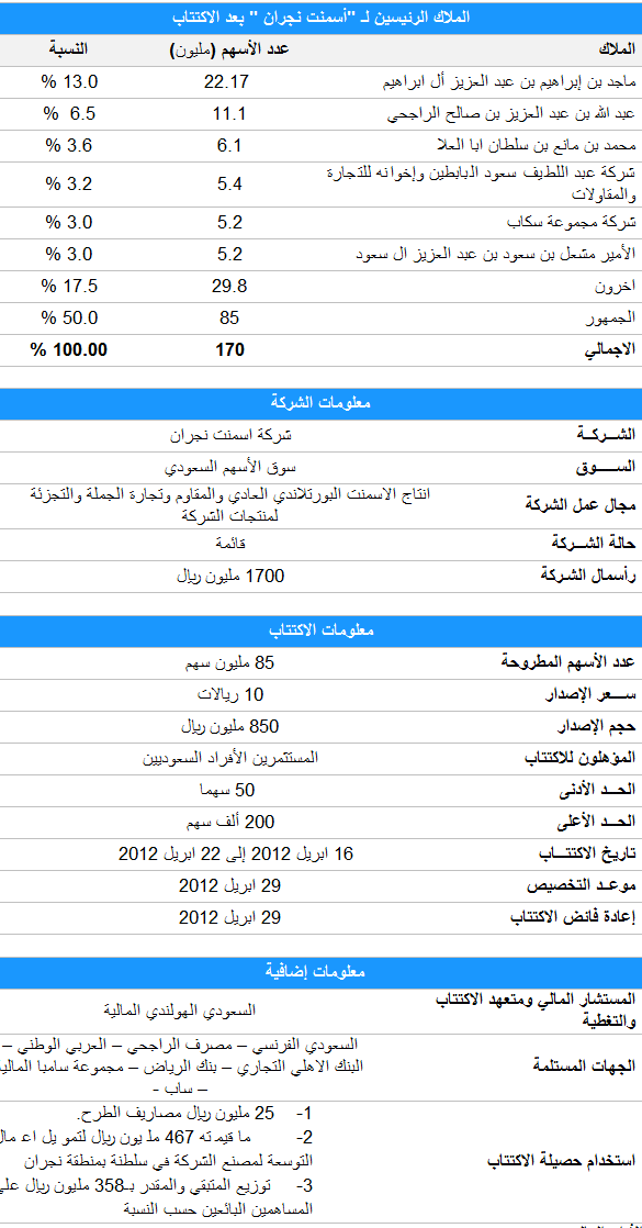 أصدرت شركة أسمنت نجران اليوم نشرة الإصدار الخاصة باكتتاب الشركة، حيث تعتزم طرح 85 مليون سهم للاكتتاب العام للمواطنين السعوديين بسعر 10 ريالات للسهم الواحد، إعتبارا من الإثنين 16 أبريل 2012 إلى 22 من نفس الشهر.