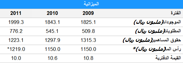 وعلى صعيد الميزانية، فقد بلغت موجودات الشركة بنهاية عام 2011 ما قدره 1999 مليون ريال، بينما بلغت حقوق المساهمين 1223 مليون ريال، كما يوضح الجدول التالي :
