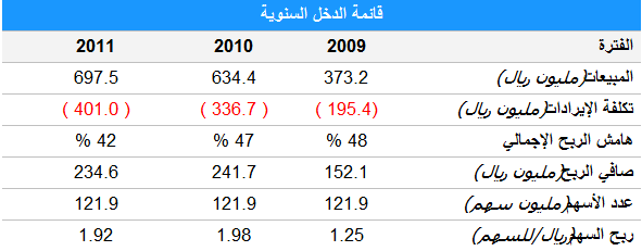 الأداء الماليحققت الشركة ايرادات قدرها 697.5 مليون ريال بنهاية عام 2011، مقابل 634.4 مليون ريال حققتها خلال عام 2010، فيما بلغت أرباحها الصافية خلال عام 2011 ما قدره 234.6 مليون ريال مقابل أرباح قدرها 241.7 مليون ريال خلال عام 2010، كما يوضح الجدول التالي: