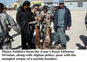 نشرت صحيفة أمريكية، صورا لجنود أمريكيين يظهرون يتلاعبون مع جثث مسلحين أفغان مشوهة، لالتقاط صور تذكارية، وقالت صحيفة "لوس أنجليس تايمز"، إن جنود الفرقة 28 الجوية كانوا بمركز شرطة في اقليم زابول الافغاني في فبراير 2010، وعادوا لزيارته بعد عدة أشهر، والتقطت الصور في المناسبتين.