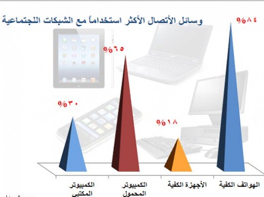 و في سؤال عن مخاطر هذه الشبكات ، أجاب 85% بأن المخاطر تعتمد على نوعية الاستخدام الشخصي و ذكر 18% بأنه ليس هناك مخاطر من استخدام هذه الشبكات وقال 5% منهم بأن هناك مخاطر حقيقية وراء استخدام هذه الشبكات. وحول الوسيلة التي يستخدمها السعوديون في الوصول الى الشبكات الاجتماعية ، ذكر 84% من المستطلعين بأنهم يستخدمون الهواتف الذكية مثل الايفون و البلاك بيري ونوكيا سمارت و أتش تي سي في الوصول لهذه الشبكات ، بينما ذكر 65% منهم بأنهم يستخدمون الكمبيوتر المحمول في الوصول لهذه الشبكات ، بينما ذكر 30% منهم بأنهم يستخدمون الكمبيوتر المكتبي في الوصول لهذه الشبكات.