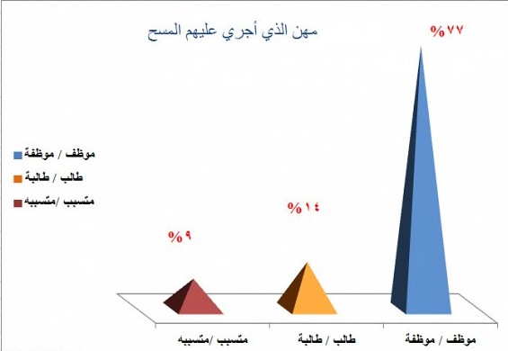 و أظهر المسح تفوقا واضحا للذكور في استخدام الشبكات الاجتماعية مقارنة بالاناث حيث ذكر 71% من الذكور بأنهم يستخدمون الشبكات الاجتماعية مقارنة ب29% من الاناث اللاتي شملهن المسح. كما توصل المسح الى أن السعوديين في الفئة العمرية من 30 و حتى 35 هم الأكثر استخداما للشبكات الاجتماعية. يذكر أن 96% من الذين شملهم المسح ذكروا بأن لديهم حساب في الشبكات الاجتاعية المختلفة مثل فيسبوك و تويتر و لينكد إن.