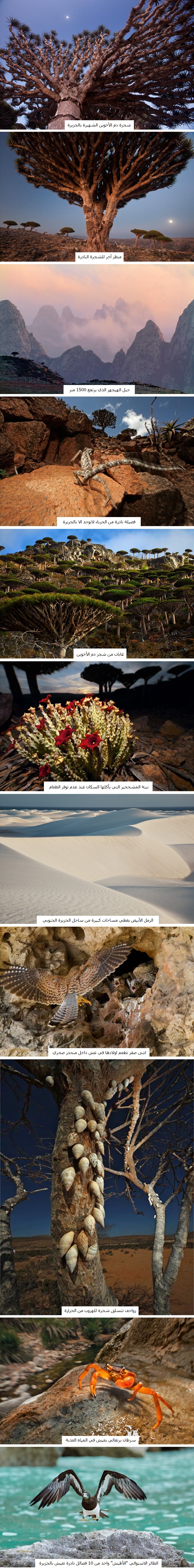 وتظهر الصور نباتات غريبة جدا لها قدرة على مقاومة الطقس الجاف والحار والذي تهب به الرياح بشكل مستمر. يذكر أنه تم تصنيف الجزيرة كأحد مواقع التراث العالمي في عام 2008 ، كما تلقب بأكثر المناطق غرابة في العالم.